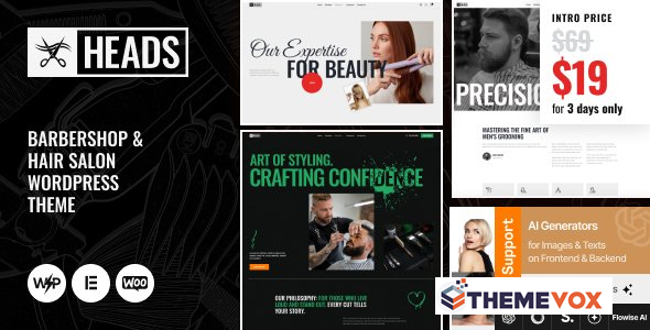Heads – engaging, modern & responsive Barbershop & Hair Salon WordPress Theme. It has an impressive fresh design for barbershops, piercing studios and tattoo salons. It is great for single & corporate barber, tattoo master, hair care stylist, tattoo artist, hipster styling, hair dresser shop, hair cutting store, makeup master and grooming.